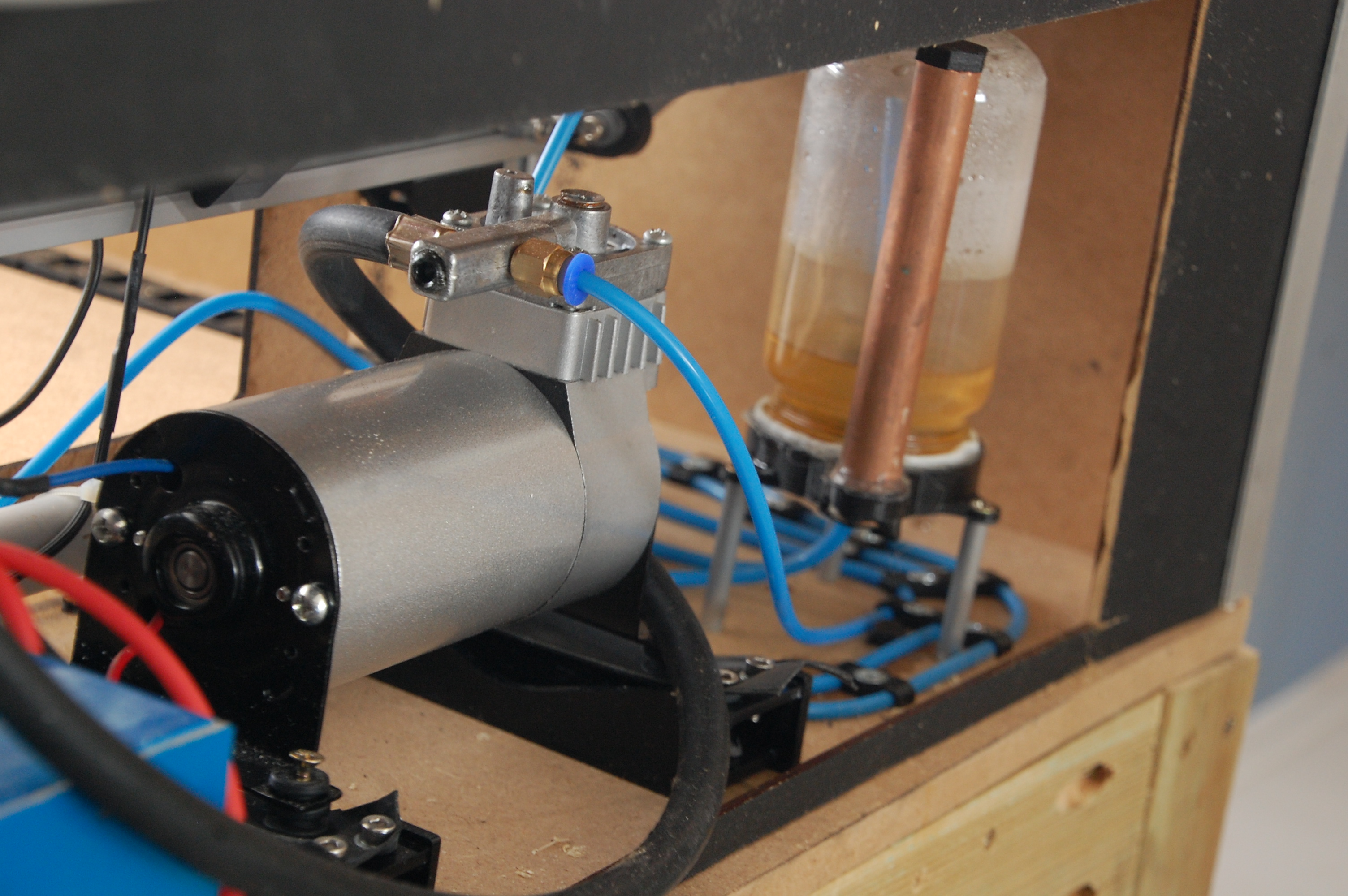 I used a regular 12V air compressor, it doesn’t need to be really power full. Membrane compressors suit the best this application since there generate less vibration and noise, but the cost is hire.