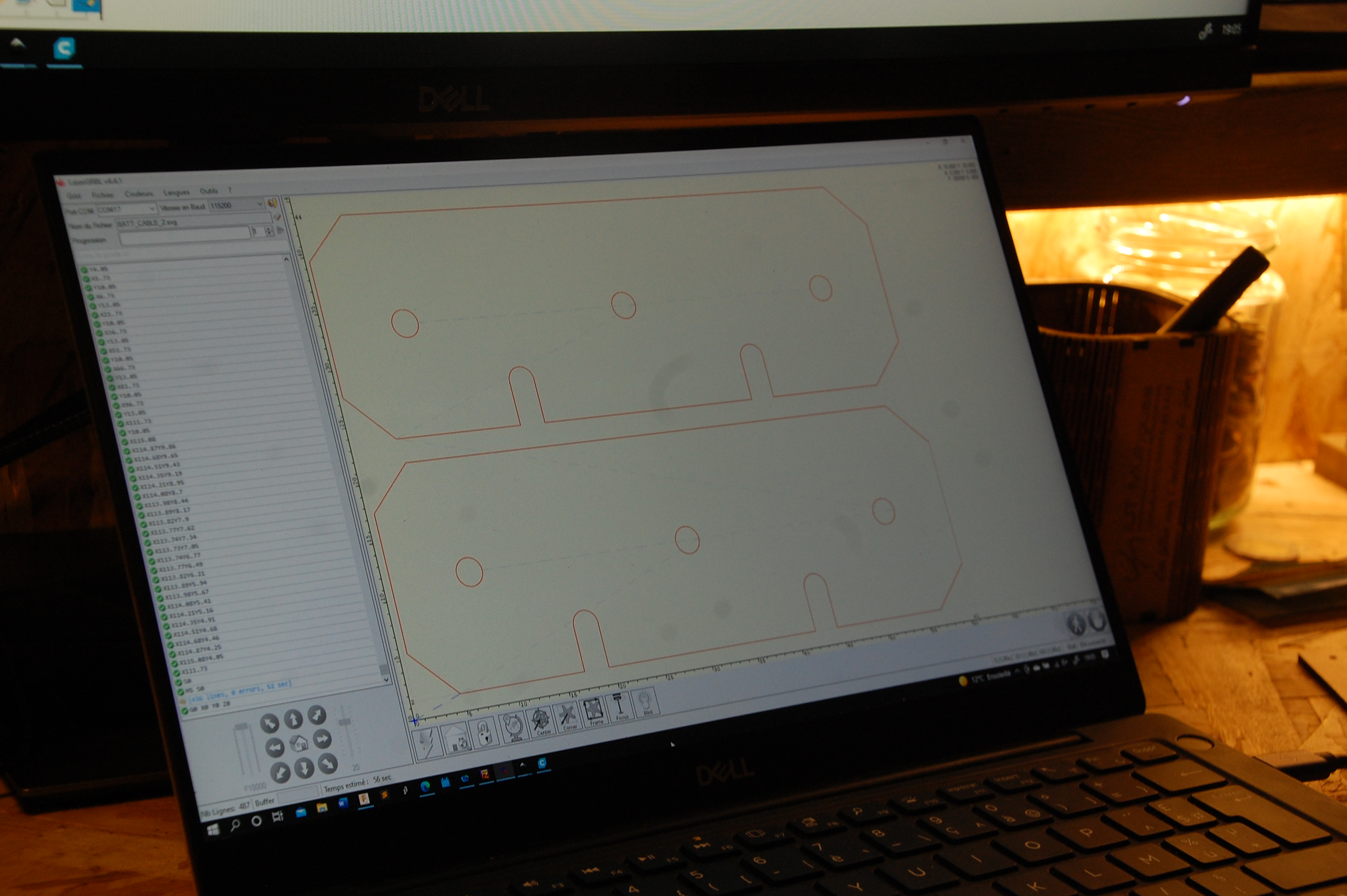 LaserGRBL is transforming SVG files into Gcode. Then it sends the code line by line to the machine. A lot of settings can be programmed: auto homing cycle, motion acceleration, travel speed and so on… This software also allows to control the machine manually. I can control the X and Y motions as well as turn on the laser. It is also possible to send individual Gcode command lines thanks to the serial monitor.