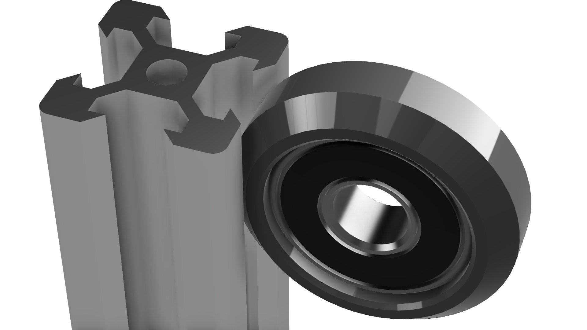 For the main frame, I chose V-slot aluminium profiles since they are the most modular option I can think of. The modularity leaves room for upgrades in the future. It is possible to assemble them easily thanks to T-slot bushings and fittings. V-slot aluminium profiles can also be used as linear guides because of their V shape. Then we use what I call V-bearings to slide on the aluminum profile: