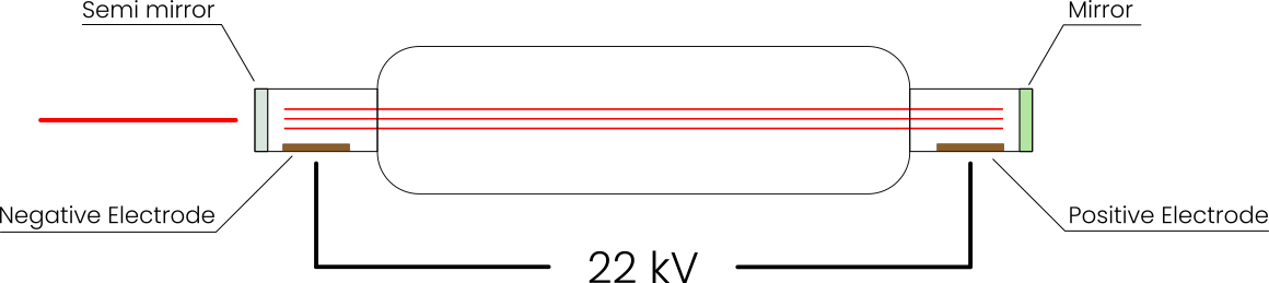 At each end of the tube there is a mirror. On one side it is a regular mirror that reflects all the light. And on the other side it is a semi-mirror. This system amplifies the beam, and when the light exceeds an amount of energy, it crosses the semi-mirror and exit the tube.