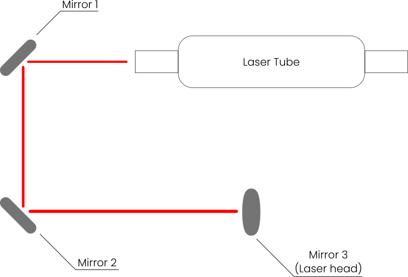 The beam is going straight out of the laser tube. Now the beam has to be redirect to the laser head. At this point, the easiest solution would be to use an optic fibre. Optic fibres can’t accept the CO2 laser wave length. That’s why I used ceramic coted mirrors. Here is schematics of how it is working.